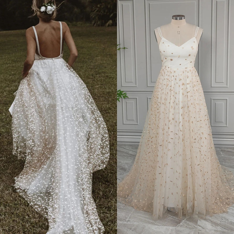 Spaghetti Straps Glitter Wedding Dress | Shiny Tulle V-Neck Boho Bridal Gown wit