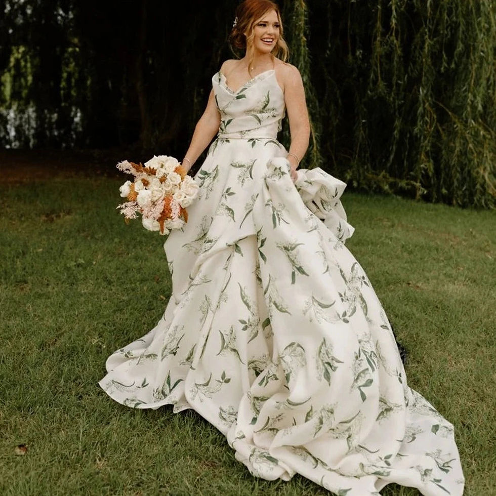 Pastoral Floral Print Chiffon A-Line Wedding Dress with V-Neck and Sleeveless De