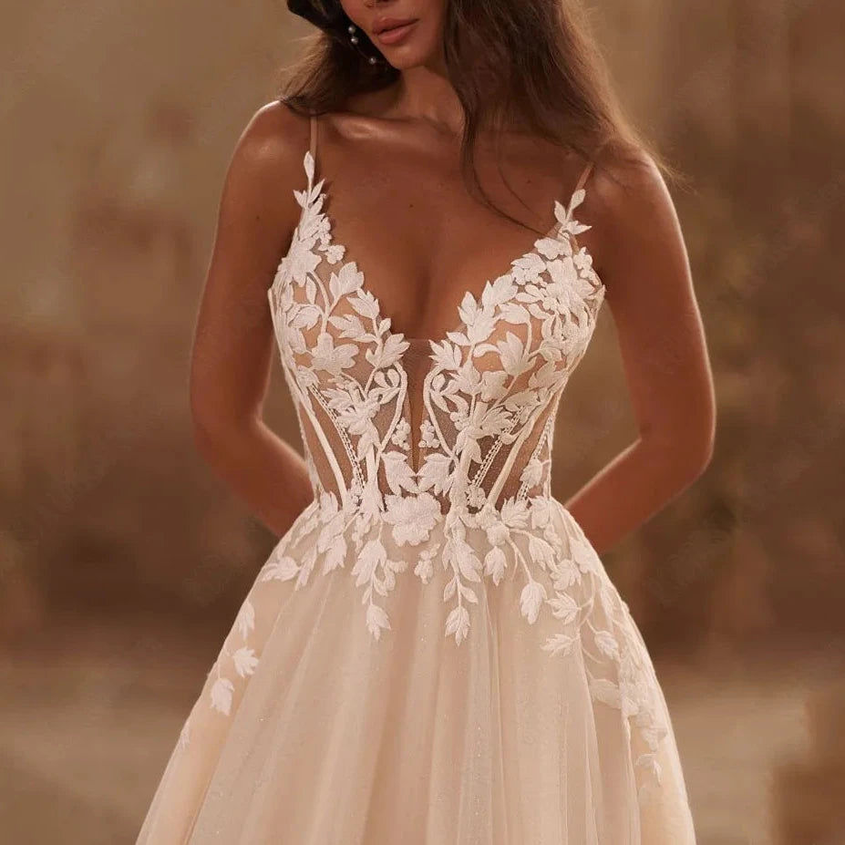 Bohemian Lace Wedding Dress | V-Neck, Spaghetti Straps, Backless, A-Line Beach B