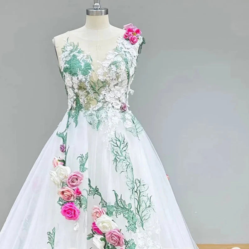 Whimsical Floral Embroidered Wedding Dress – V-Neck, Backless, Tulle A-Line Go