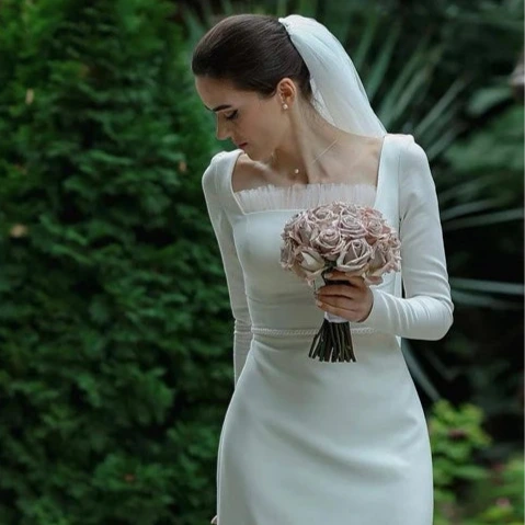 Soft Satin Long Sleeve Modest Wedding Dress with Square Neck and Elegant A-Line
