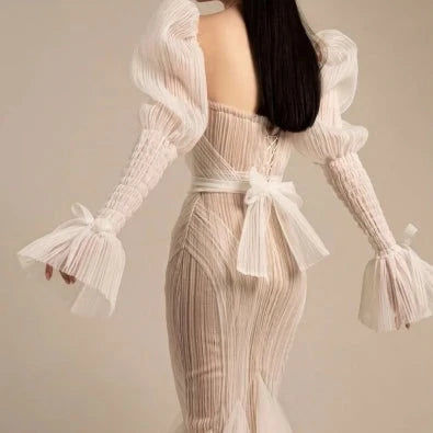 Boho Sweetheart Mermaid Wedding Dress with Puff Sleeves and Backless Design