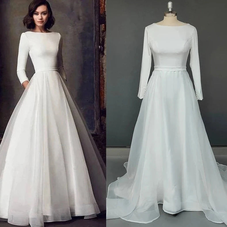 Classic A-Line Satin Wedding Dress with Long Sleeves and O-Neck | Elegant Muslim