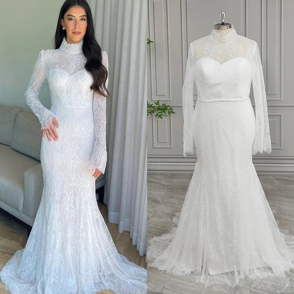 Modest Lace Mermaid Wedding Dress with Long Sleeves, High Neck, and Sweep Train